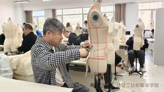 培训期间,杨旭副教授依托扎实的理论功底与丰富的企业实践经验,课程内容既覆盖人台标记、坯布固定等基础环节,更聚焦立体裁剪中的造型创新、版型转化等核心技术。结合国际品牌设计案例与本地企业生产实例,通过分步拆解、互动答疑、作品互评等方式,引导学员掌握将创意转化为精准版型的实战能力。