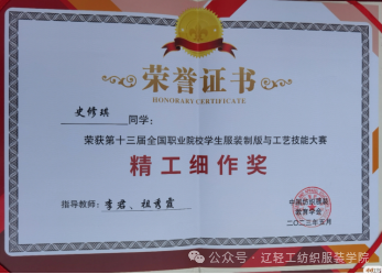 在校期间多次在国家、省、市级职业技能大赛中获奖,为学院赢得多项荣誉。与企业专家同台竞技,获得辽宁省十佳制版师第一名的称号。